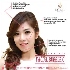 Salah satu facial adalah Facial Bubble C. Facial Bubble C adalah perawatan wajah dengan menggunakan bahan aktif dari Vitamin C murni yang dipadukan dengan bahan lain yang bermanfaat untuk mengatasi problem pigmentasi, kulit kusam, kerutan halus dan dapat meremajakan kulit. Selain itu Facial Bubble C juga dapat memberikan efek pada kulit wajah menjadi semakin cerah, bercahaya, lembut, kenyal dan awet muda. Treatmen ini disebut bubble karena pada saat proses facial akan menghasilkan buih seperti bubble akibat reaksi aktif dari peeling pada kulit.